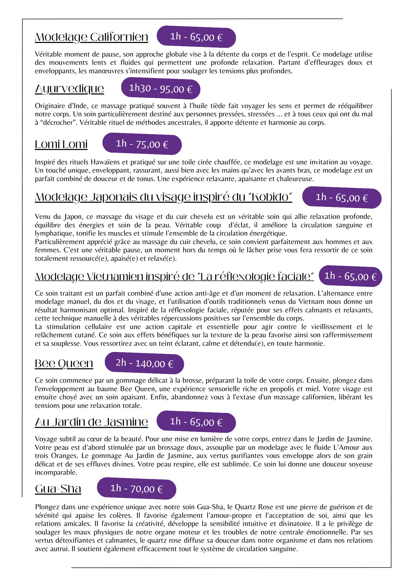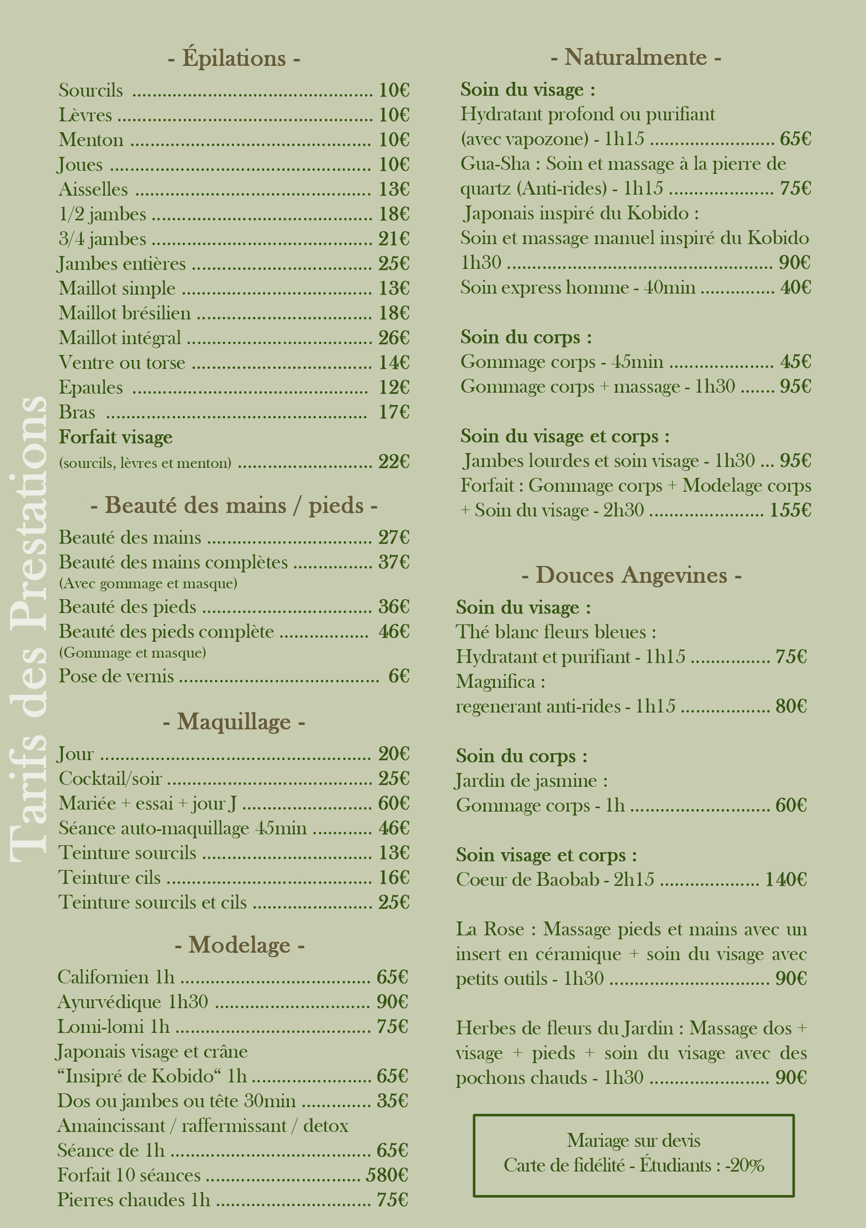 - Shampoing brushing : de 24 à 33 euros - Shampoing coupe coiffage ou brushing : de 46 à 56 euros - Shampoing coupe coiffage homme : 26,00 euros - Forfait coloration végétale : de 72 à 99 euros - Forfait coloration sans ammoniaque : à partir de 67 euros - Dose supplémentaire : de 13 à 34 euros - Coupe énergétique : 87 euros - Balayage : de 19 à 82 euros - Permanente : de 39 à 54 euros - Lissage brésilien 100% Organique : sur devis - Forfait mariée : 150 euros - Attache ou chignon : de 45 à 65 euros - Coupe enfant : à partir de 17 à 35 euros - 20% pour les étudiants de moins de 25 ans
