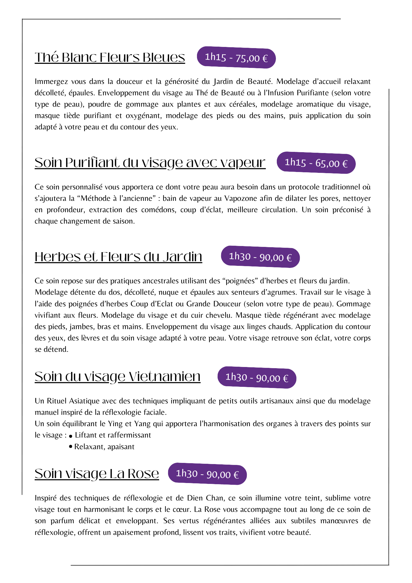 - Shampoing brushing : de 24 à 33 euros - Shampoing coupe coiffage ou brushing : de 46 à 56 euros - Shampoing coupe coiffage homme : 26,00 euros - Forfait coloration végétale : de 72 à 99 euros - Forfait coloration sans ammoniaque : à partir de 67 euros - Dose supplémentaire : de 13 à 34 euros - Coupe énergétique : 87 euros - Balayage : de 19 à 82 euros - Permanente : de 39 à 54 euros - Lissage brésilien 100% Organique : sur devis - Forfait mariée : 150 euros - Attache ou chignon : de 45 à 65 euros - Coupe enfant : à partir de 17 à 35 euros - 20% pour les étudiants de moins de 25 ans